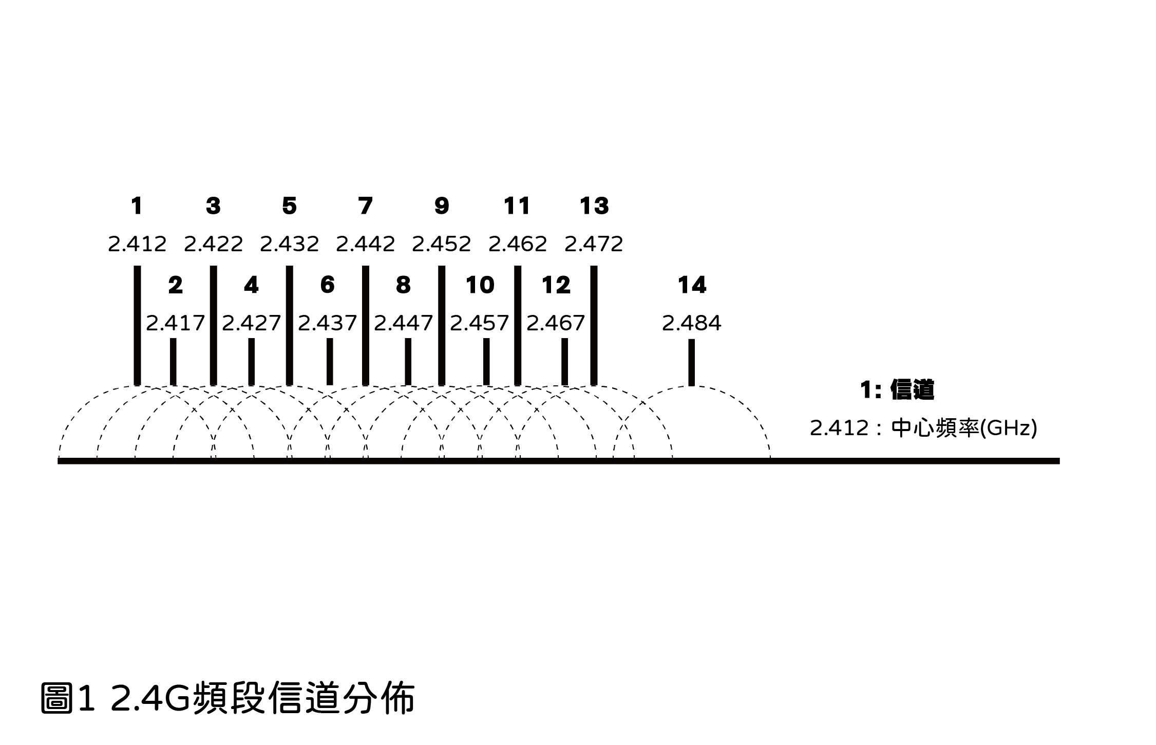 | 如圖1所示,2.4G頻段被分為14個交疊的、 錯列的20MHz信道,信道編碼從1到14,鄰近的信道之間存在一定的重疊範圍。 |